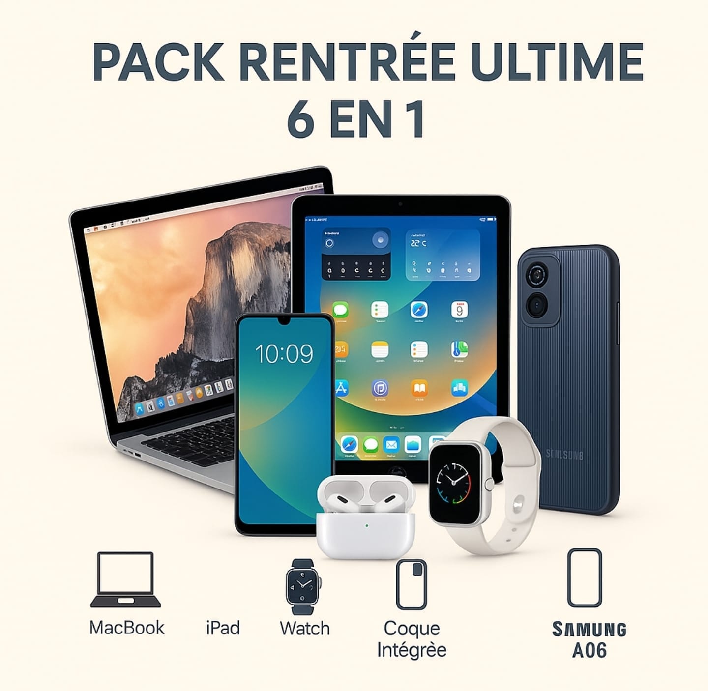 Préparez la rentrée (ou le quotidien) avec le Pack Rentrée Ultime 6 en 1, une offre exceptionnelle regroupant les essentiels high-tech pour travailler, étudier, communiquer et se divertir.